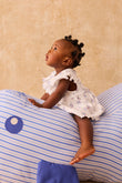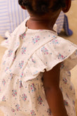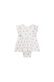 Lena romper in ribbed jersey with all-over floral print and ruffle sleeves. Designed like a small dress from the front, with a fitted body underneath for a secure fit. Finished with gentle gathers at the waist and snap buttons at the crotch for quick changes. Easy on its own in warm weather, or layered with leggings and a cardigan. Curated by CO LABEL for the soft rib feel and the ruffle detail that sits neatly under layers.