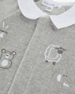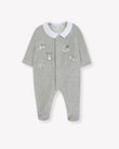 Velour baby sleepsuit with a pointed woven-cotton collar and delicate alphabet embroidery; soft on skin with snap fastenings for easy changes and machine-washable care. Main 80% cotton, 20% polyester; collar 100% cotton. Curated by CO LABEL for gentle feel, simple finish, and everyday practicality.