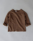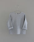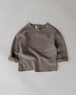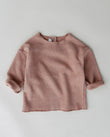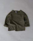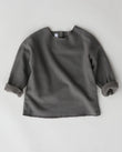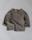 Oversized pullover in a soft, brushed cotton blend—cut wide through the body with raw edges at neck, cuffs, and hem. A back-neck snap simplifies dressing; sleeves roll for growing room. Made in Italy and designed in Copenhagen for year-round wear: light indoors, easy to layer over a tee in cooler weather.