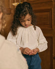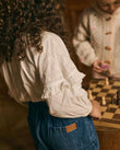 The Irisa Blouse in ivory is cut from 100% organic woven cotton. Tone-on-tone embroidery and light gathers add texture. A round neck with a small button keeps the line clean. Frilled sleeve seam and elastic cuffs finish the fit. The relaxed shape allows movement and layers easily. Curated by CO LABEL for natural fibre and everyday ease.