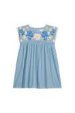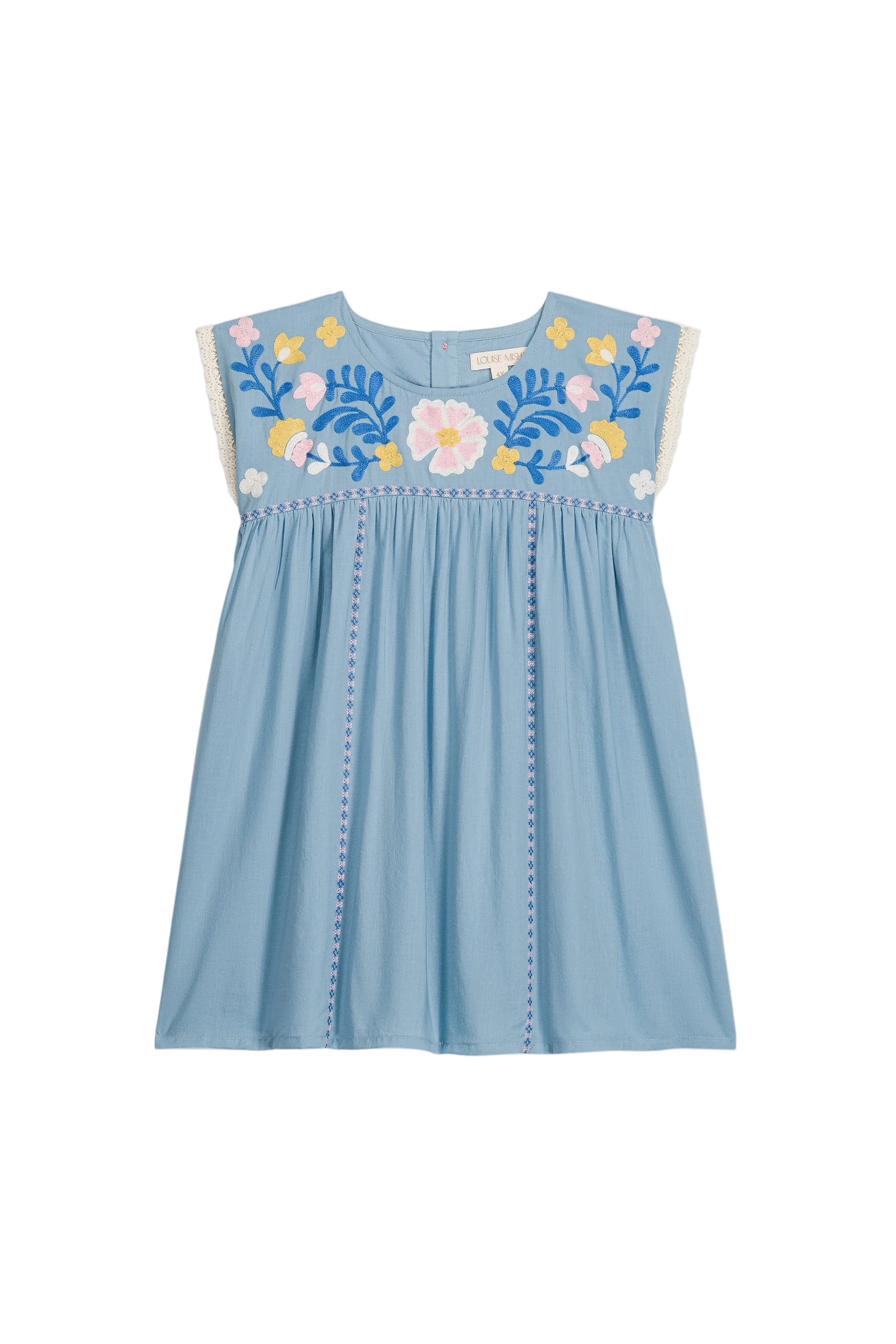 Talula dress with embroidered yoke in lightweight woven fabric. Cut with a round neck, a gently gathered skirt, and cap sleeves finished with a fine lace trim. The yoke is detailed with floral embroidery, with narrow stitched lines running down the front for a clean finish. Closes at the back for easy dressing. Style with sandals, or add a cardigan for extra warmth. Curated by CO LABEL for the craft details and a shape that stays comfortable through the day.