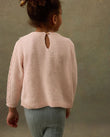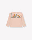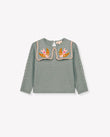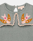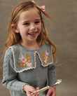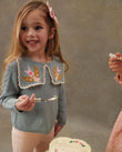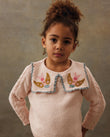 A soft cotton-cashmere knit with a storybook collar: two embroidered birds perched on square knit panels finished with a scalloped edge. The body has a textured seed-stitch, sleeves in delicate openwork, and neat rib trims; a keyhole button at the back slips on easily. Pair with denim, cords, or a tulle skirt for everyday play to birthdays. 95% cotton, 5% cashmere knit.