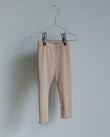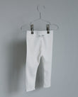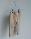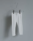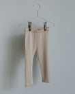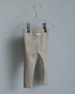 Rib-knit leggings in soft 100 % cotton, finished with raw hems for a clean, relaxed look. A wide elastic waistband sits gently against the skin and stays in place while your baby moves. True-to-size fit for everyday wear—pair with a bodysuit indoors or layer under knitwear on cooler days.