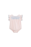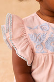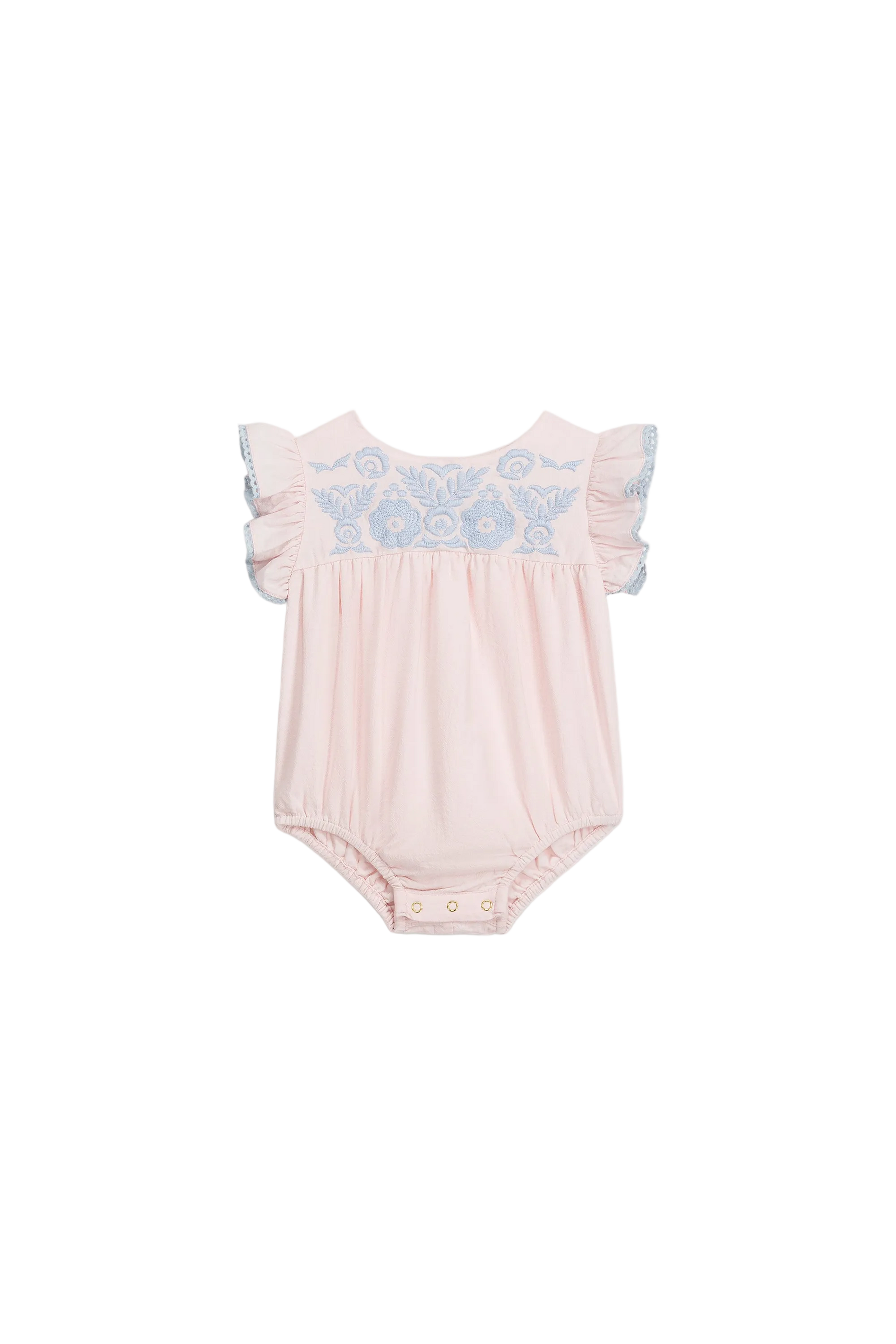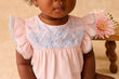 Nusha romper with embroidered yoke and ruffle sleeves. Soft, gathered body with a rounded shape and elastic at the legs for a secure fit. Finished with contrast trim at the sleeves and snap buttons at the crotch for quick changes. Wear on its own, or layer with leggings on cooler days. Curated by CO LABEL for the embroidered panel and the way it sits neatly under knits and jackets.