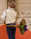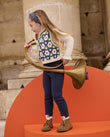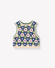 A charming hand-crocheted layer in 100% cotton knit, pieced from granny-flower squares in cream, forest, cobalt and violet with a sweet bobble-scallop edge and ribbed hem; sleeveless and slightly cropped for easy slip-on styling over blouses, tees or dresses, adding artisanal texture and color without bulk for playdates or parties — curated by CO LABEL for craftsmanship, playful palette, and everyday layering.