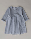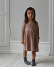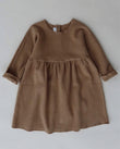 Designed in Copenhagen and made in Italy from warm-cotton knit brushed on both sides for a cashmere-soft feel. The empire waist falls into a gathered skirt, while raw edges finish neck, cuffs, and hem. Snaps run from neck to waist at the back for easy dressing. Durable for play, comfortable for everyday wear—layer over leggings when temperatures drop.