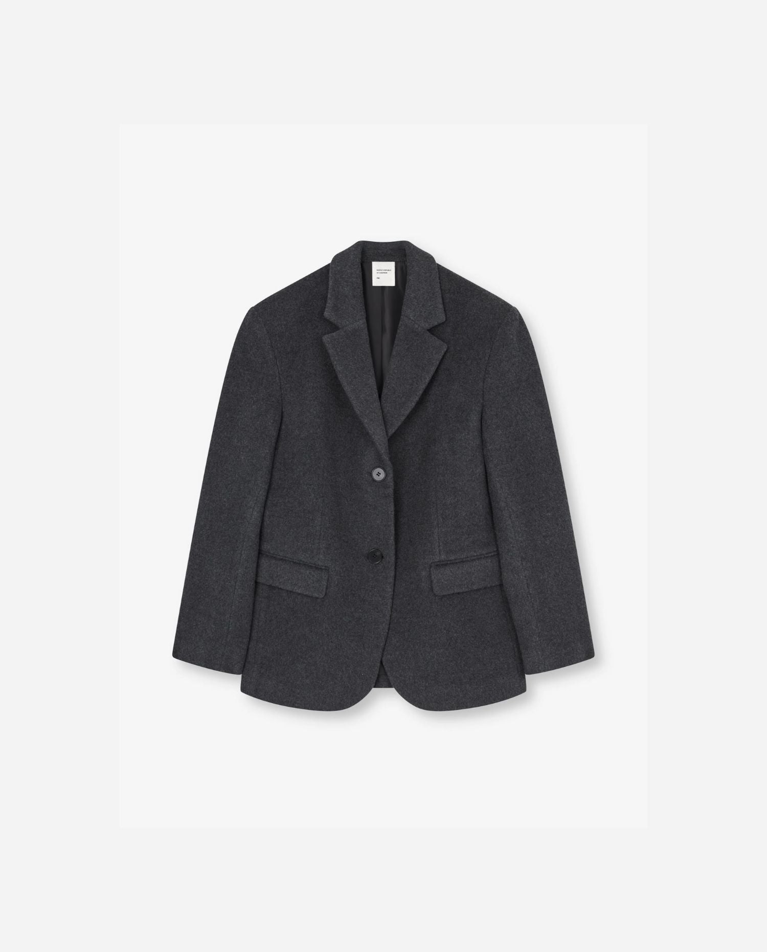 The Women’s Oversized Blazer in Heather Grey is cut from a 650g single-face blend of 90% wool and 10% cashmere, offering both structure and softness. Supported by a single front button, it drapes effortlessly over the body to create a relaxed yet refined silhouette. Designed with subtle shoulder shaping and clean lines, this piece serves as a wardrobe staple, elevating both tailored and casual looks.